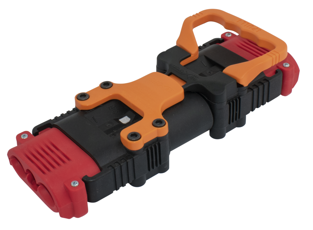 Afin de garantir la bonne connexion entre les connecteurs mâles et femelles, Eaxtron a mis au point et breveté un dispositif de verrouillage innovant et agile. Ce dispositif de verrouillage est composé d’une poignée de verrouillage fixée par défaut sur le connecteur femelle et d’un contre-verrou vissé sur le connecteur mâle.