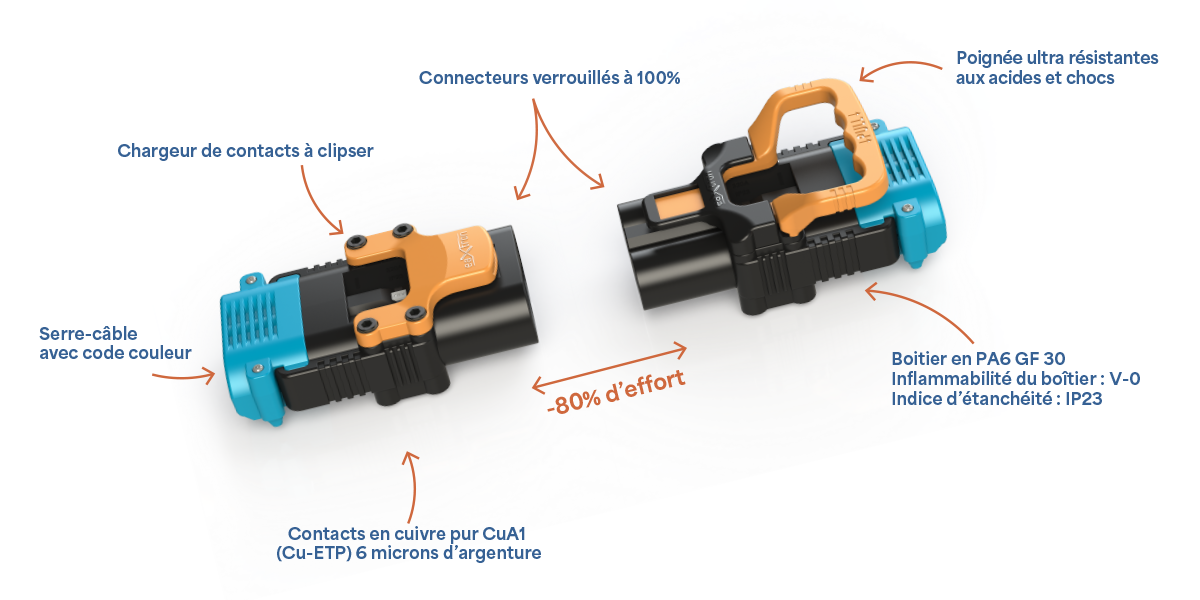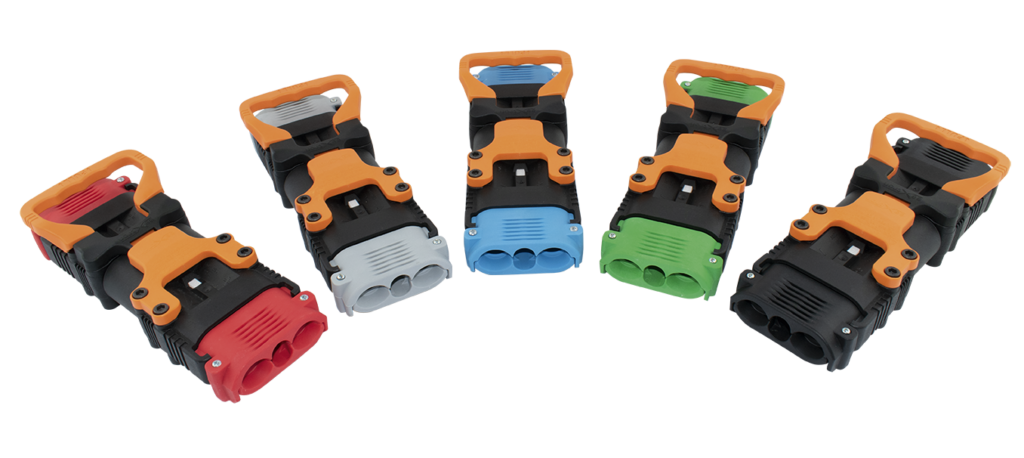 Nos connecteurs 160A et 320A sont équipés de brides de câbles colorées, permettant d’identifier facilement la tension de l’appareil sur lequel il est installé, prévenant les risques de destruction d’équipements non adaptés.