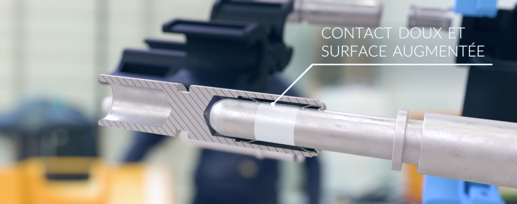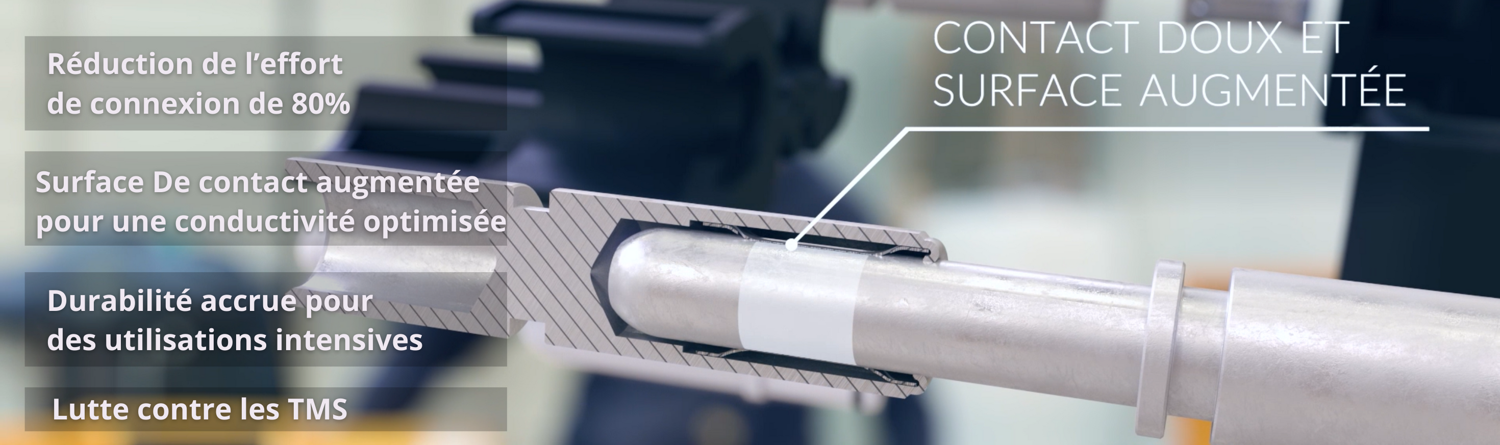 La surface de contact entre les connecteurs mâles et femelles SECURISOFT est plus longue que celle de contacts traditionnels, permettant d’atteindre des performances optimisées avec un effort réduit.