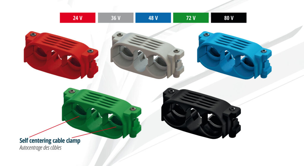 EAXTRON Innove encore en proposant des brides de câbles de couleur permettant un repérage rapide de la tension de la batterie.