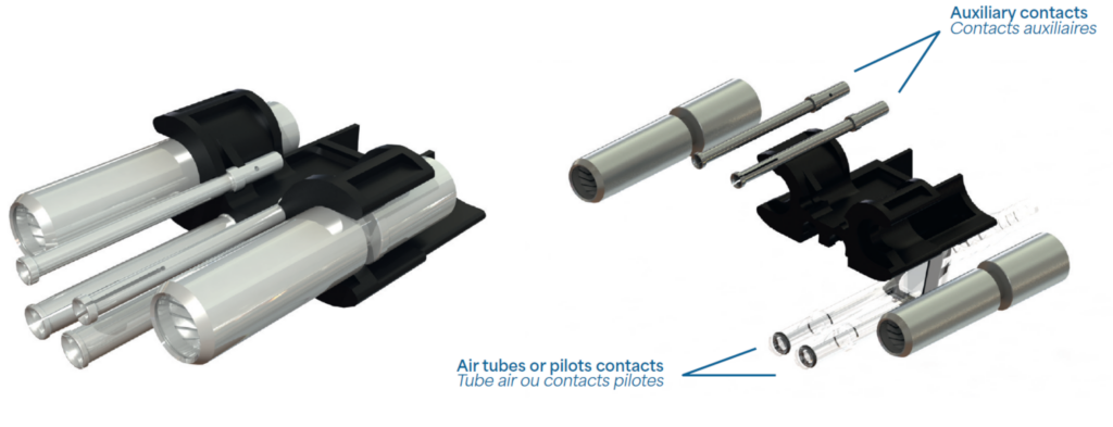 Le chargeur de contact de la gamme Eaxtron facilite l’installation et le câblage des différents contacts (principaux, auxiliaires , pilote et tube air) grâce à son design permettant de simplement clipser ces éléments.